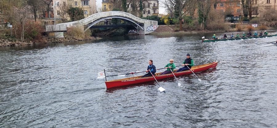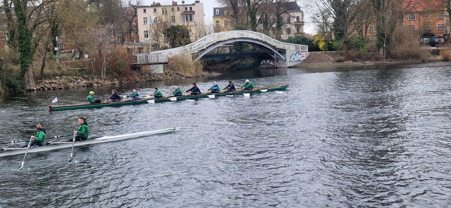 Trotz des launigen und fast schon aprilhaften Wetters zog es zum Start der Osterferien viele Ruderkameradinnen und Ruderkameraden ins Bootshaus, denn der Veranstaltungskalender rief zum traditionellen Anrudern auf. Die offizielle Saisoneröffnung wurde nach dem langen Winter mit viel Eis auf den Gewässern auch herbeigesehnt und so waren 17 Boote am 28. März auf dem Wasser, um die ersten Kilometer auf der Havel zu sammeln. Von Jung bis Alt besetzten die Aktiven alle Bootsklassen. Es ist jedes Mal ein schönes Bild, wenn vom Einer bis zum Achter alle an der Jahrtausendbrücke auf das „Hipp Hipp Hurra“ warten und dann gemeinsam gestartet wird. Auch einige Schaulustige beobachteten das bunte Treiben vom Land aus und ein vor der Werft liegender Freizeitkapitän gab mit lauter Hupe ebenfalls seinen „Segen“ für die Ruderinnen und Ruderer des R.C.H.B. in der diesjährigen Saison.