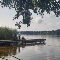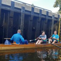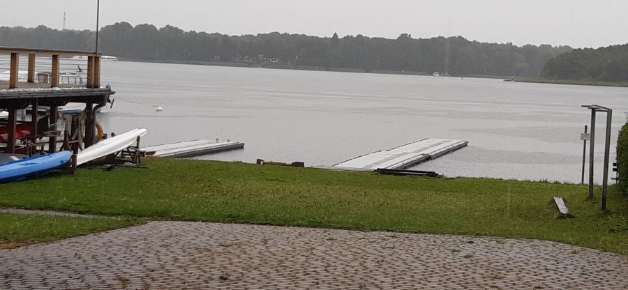 Unsere Mittagspause legten wir an der Badestelle neben der Deutschen Richterakademie in Wustrau ein. Dabei überholten uns leider die Berliner Frauen, was dann unsere Ankunft am Ruderclub bei kurz zuvor einsetzendem Regen etwas blockierte. Nach 21 Ruderkilometern ging es dann ans Boote-Putzen und das Einparken der Boote unter der Terrasse des kleineren Bootshauses.