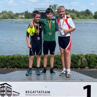 Der gastgebende R.C.H.B. selbst, war mit 6 Kindern am Start und jeder konnte mindestens einmal aufs Siegertreppchen klettern. Von den drei Goldmedaillen nahm Roque Schwarz stolz gleich zwei entgegen. Er siegte im Einer AK 12 und noch einmal mit Eddie Hennig im Doppelzweier AK 11/12. Eddie kämpfte sich im Leichtgewichts-Einer AK 12 auf den zweiten Platz. Zum sehr guten Abschneiden der Brandenburger Nachwuchsruderer steuerte der 11-jährige Moritz Böhme durch seinen Sieg im Einer die dritte Goldmedaille bei. Nur knapp am ersten Platz vorbei, kam Julian Meo Franken als Zweiter im Einer AK 12 ins Ziel.