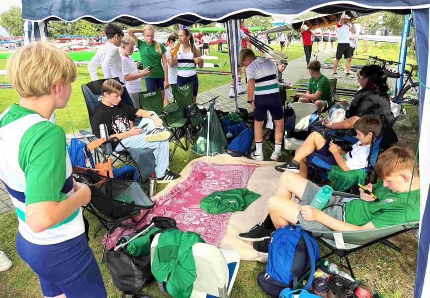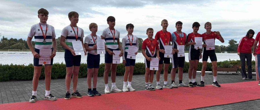 Der Jungen-Doppelvierer mit Steuermann AK 13/14 mit Julian Meo Franken, Roque Schwarz, Eddie Hennig, Maxim Erler und Steuermann Moritz Böhme taten es ihr gleich, die Silbermedaille war der verdiente Lohn.