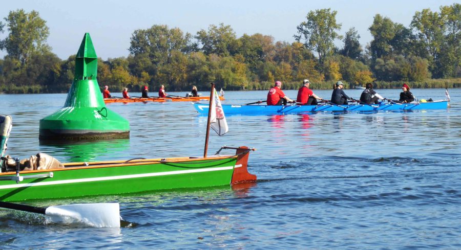 Gut gestärkt ging es dann alsbald auch wieder mit unveränderten Besatzungen zurück in die Boote. Mittlerweile war es Nachmittag und optimale 16 Grad warm. Der Wind hatte etwas an Kraft gewonnen, störte uns aber nicht nachhaltig. Der Verkehr auf dem Wasser hatte etwas zugenommen und so schwappte doch die eine oder andere Welle in die Boote. Aber weder die Wellen noch ein kleiner Defekt in einem der Boote konnten uns aufhalten. Zwischendurch wurden auf dem Wasser immer wieder kleinere Erholungspausen eingelegt und fleißig die Steuerleute getauscht. Und so erreichten wir mit dem langsam einsetzenden Sonnenuntergang und bereits wieder kühler werdenden Temperaturen gegen 18 Uhr das Vereinsgelände an der Näthewinde. Wie es sich gehört, wurden im Anschluss noch alle Boote gründlich gereinigt und anschließend wieder sicher in der Bootshalle verstaut.